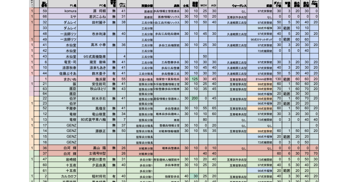 参加人数確認チェック,通し番号,PL名,PC名,指揮官資格,パワーソース,所属分隊,兵科,士気,通信判定,MOV,AGI,ウォードレス,武器,ダメージ値,対象数,最小射程,最大射程,ダメージ無効値