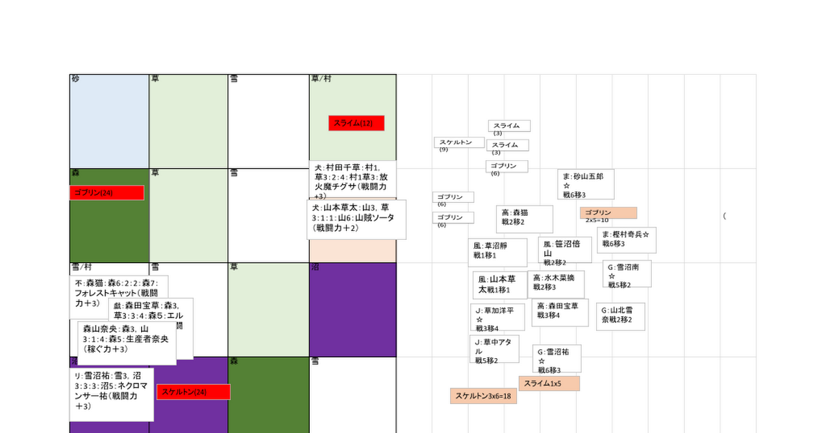 今回のMAP 砂草雪草 森草雪山 雪雪草沼 沼沼森雪 街13 村9 村4