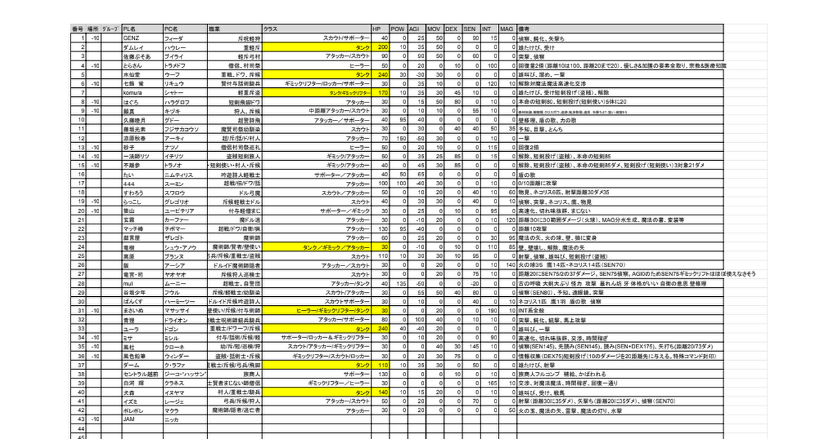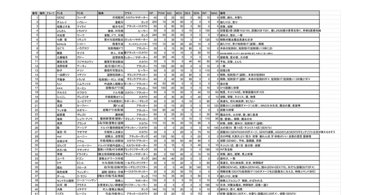 番号,場所,グループ,PL名,PC名,職業,クラス,HP,POW,AGI,MOV,DEX,SEN,INT,MAG,備考