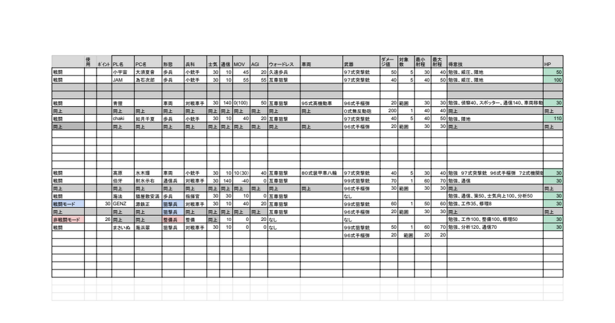 用,ポイント,PL名,PC名,形態,兵科,士気,通信,MOV,AGI,ウォードレス,車両,武器,ダメージ値,対象数,最小射程,最大射程,得意技,HP