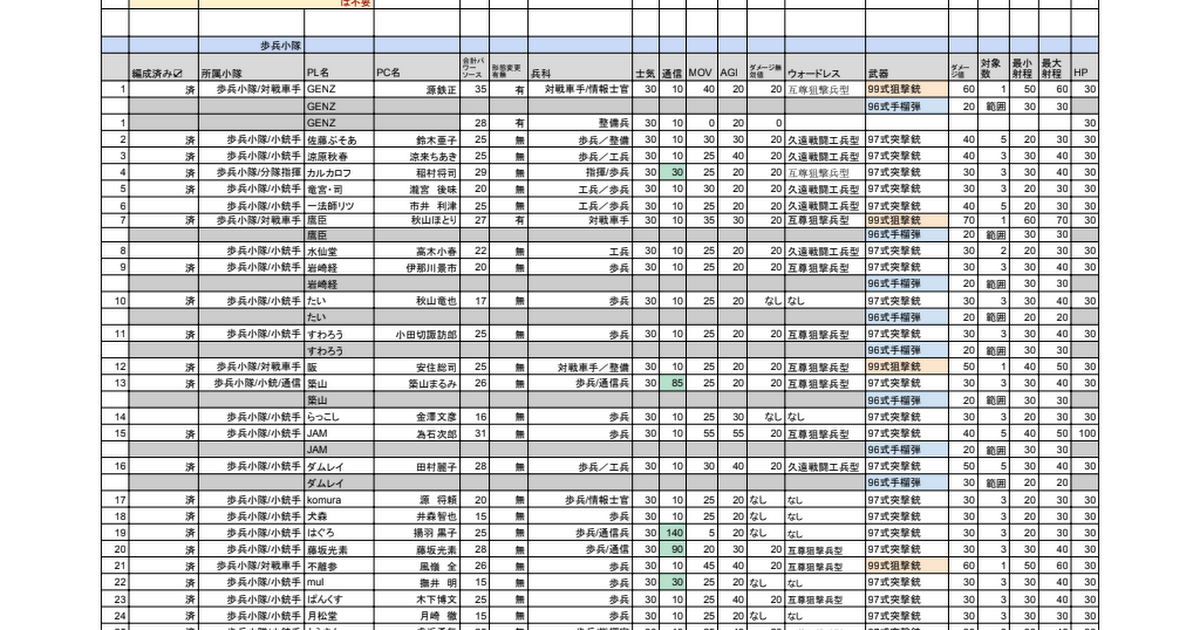 所属小隊,PL名,PC名,合計パワーソース,形態変更有無,兵科,士気,通信,MOV,AGI,ダメージ無効値,ウォードレス,武器,ダメージ値,対象数,最小射程,最大射程,HP