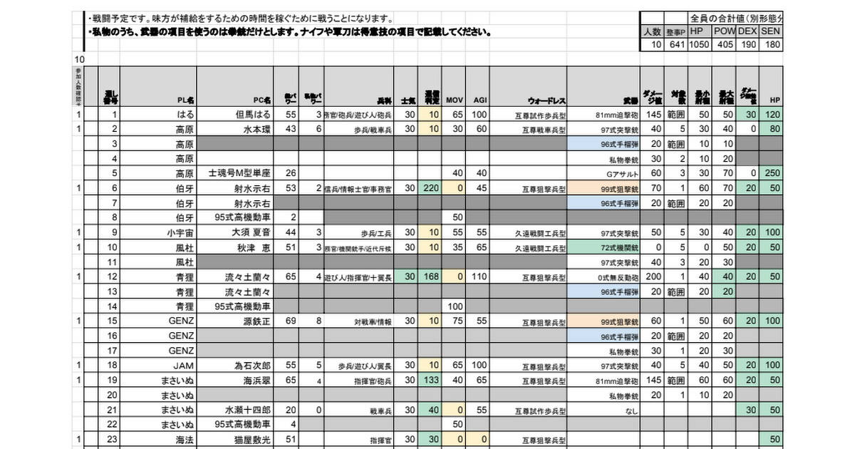 ・私物のうち、武器の項目を使うのは拳銃だけとします。ナイフや軍刀は得意技の項目で記載してください。,人数,整事P,HP,POW,DEX,SEN