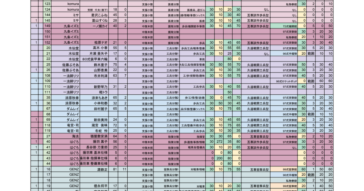 参加人数確認チェック,通し番号,PL名,PC名,総パワー,私物パワー,所属小隊,所属分隊,兵科,士気,通信判定,MOV,AGI,ウォードレス,武器,ダメージ値,対象数,最小射程,最大射程
