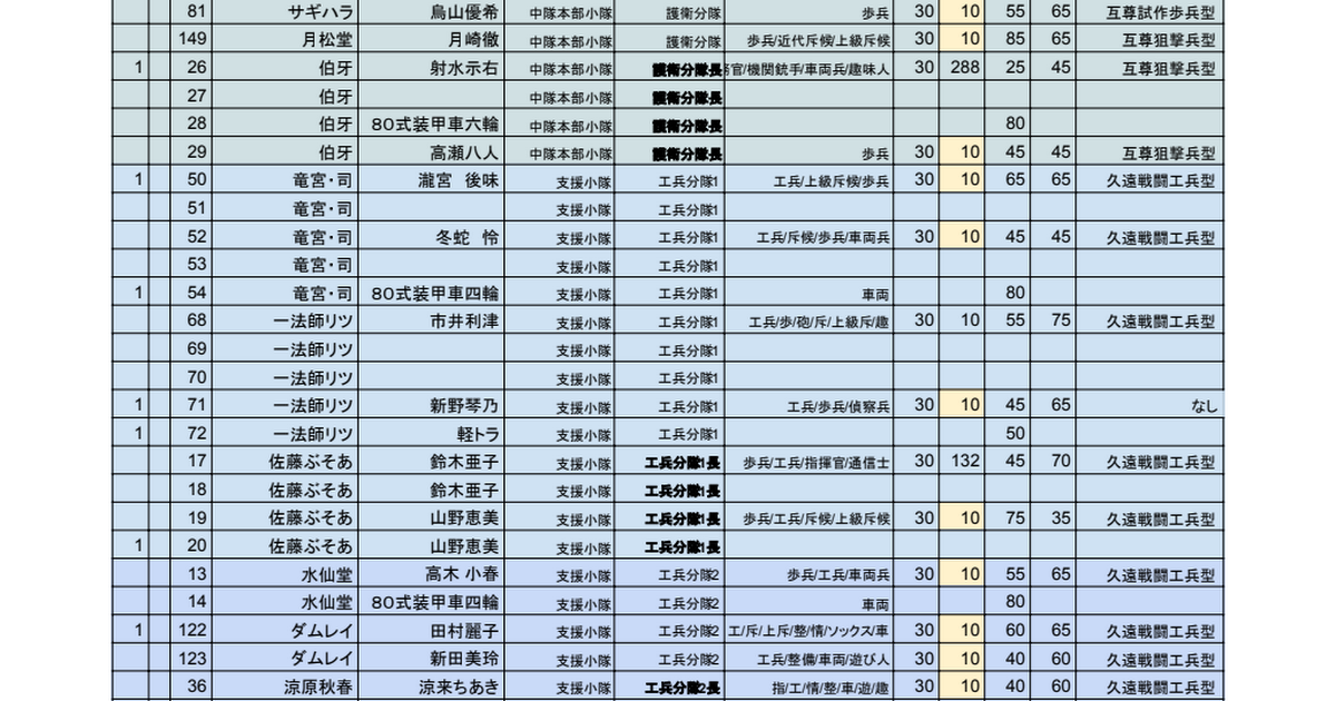 参加人数確認チェック,通し番号,PL名,PC名,所属小隊,所属分隊,総パワー,私物パワー,機関銃パワー,戦車車両パワー,前回の所属小隊,前回の所属分隊,転属希望有無,兵科,士気,通信判定,MOV,AGI,ウォードレス
