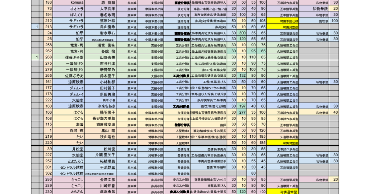 参加人数確認チェック,通し番号,PL名,PC名,初期配置,所属小隊,所属分隊,総パワー,私物パワー,機関銃パワー,戦車車両パワー,兵科,士気,通信判定,MOV,AGI,ウォードレス,武器,ダメージ値